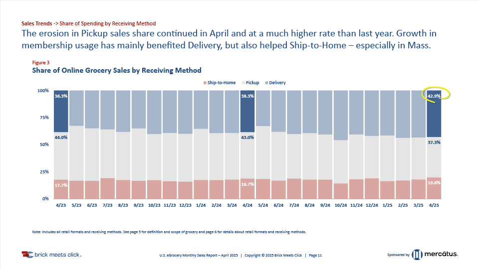 - Delivery accounted for nearly 75% of the year-over-year gains with 43% of all online grocery sales.