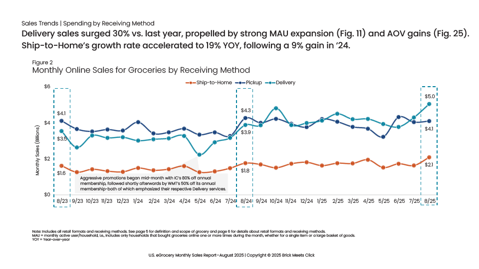 Delivery surged 30% year-over-year to hit $5.0 billion in sales, now accounting for 45% of total eGrocery spend. Ship-to-home grew 19% YOY to reach $2.1 billion, while pickup slipped slightly, down from $4.3 billion last year to $4.1 billion, representing 36.5% of sales.